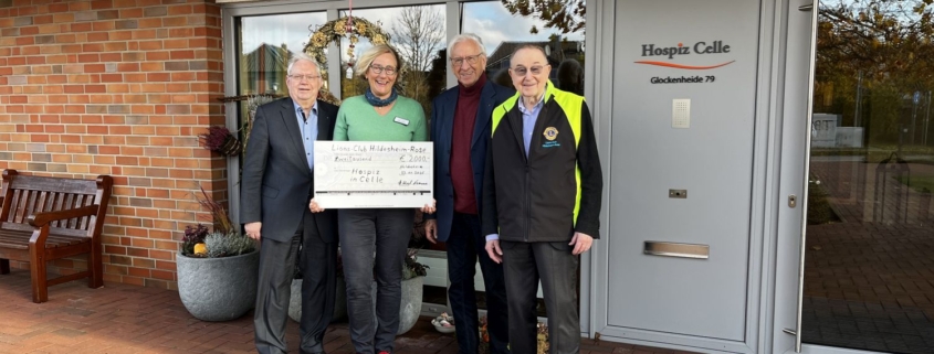 Seinen 90ten Geburtstag nutzte Reinhold Brunotte deshalb, um Spenden für die Hospizarbeit in Celle zu bitten. Zur Übergabe der 2.000 Euro kamen Lions-Club-Mitglieder Jochen-Konrad Fromme und Wolfgang Graaff mit in die Glockenheide und erwähnten das Leitmotiv der Lions: „We serve“ beziehungsweise „Wir dienen“. Wie schön, dass dieser Grundgedanke sich in diesem Fall mit einem sehr persönlichen Interesse verknüpfen ließ! Die interessierten Fragen unserer Hildesheimer Besucher beantwortete Hospizleiterin Inga Janßen gern und freute sich sehr über 2.000 Euro für die Hospizarbeit.