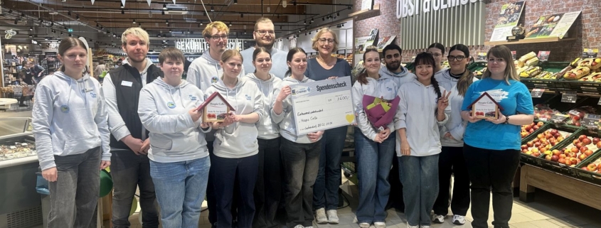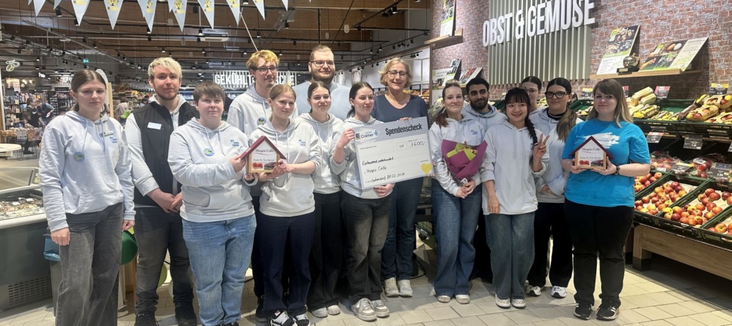 Die Auszubildenden von Edeka Cramer übergaben Hospizleiterin Inga Janßen vergangenes Wochenende eine Pfandbon-Spende in Höhe von 1.600 Euro sowie zwei Spendenhäuschen mit weiteren 370,76 Euro. Im Rahmen einer „Talente Challenge“, unter dem Motto „Think Fresh“, boten 15 Auszubildende aus drei Cramer Märkten – das „Team Lachendorf“ – den Kunden Produkte zur Verkostung an: unter anderem Schoko-Obst sowie Lemon-Quark-Sahne-Dessert, Fleischkäse, eine Pilzpfanne, Brot mit Dips … Am Samstag veranstalteten sie außerdem einen Malwettbewerb, ein „Wie viele Gemüsesorten hat Edeka im Angebot“-Ratespiel und verteilten Tattoos an junge Supermarkt-Besucher.